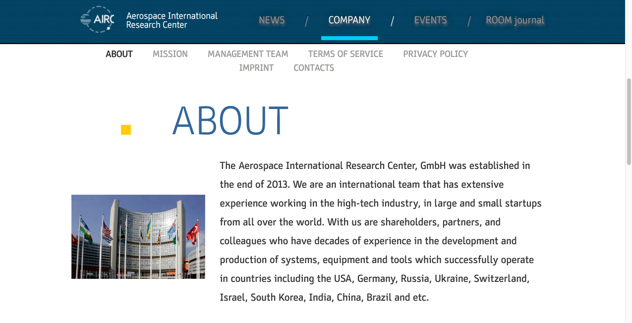 还有Asgardia所属的国际航空研究中心(AIRC),虽然挂着研究中心的名头,实质上只是家企业,除了一个简陋的主页之外很难找到任何踪迹,这家企业也归属Ashurbeyli所有。
