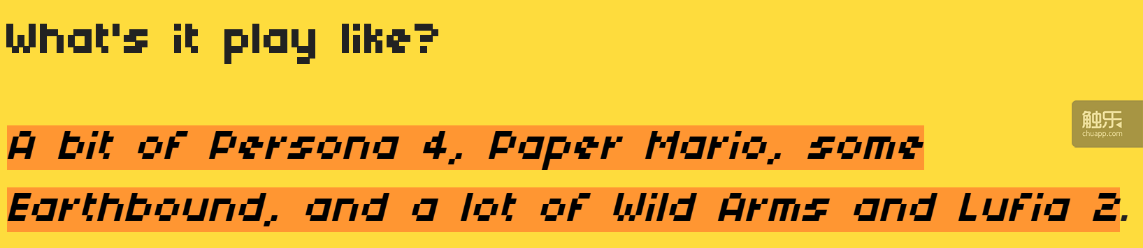 YIIK开发团队对自己作品游戏体验的描述:稍微有点像《女神异闻录4》(Shin Megami Tensei:Persona 4)和《纸片马里奥》(Paper Mario),略微有些像《地球冒险》(EarthBound),还和《荒野兵器》(Wild Arms)与《四狂神战记2》(Lufia 2)很像很像——在体验过其试玩版(ackkstudios.itch.io)之后,我的感想是:如果有人声称自己长得既像赵本山,又像金城武(请按这一思路自行列举五位……),最好不要对这种奇人异相抱有任何期待……
