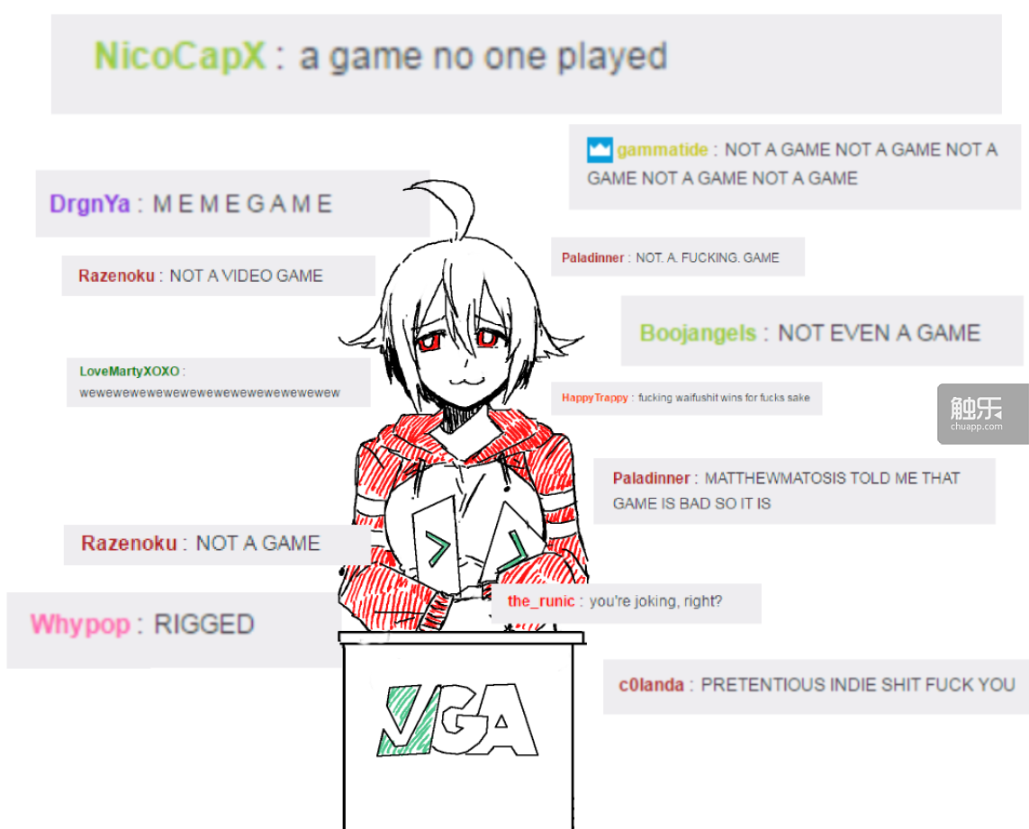 Kiririn51专门为/v/GA获奖绘制的图,边上引用的都是在Twitch观看/v/GA(2016.vidyagaemawards.com)直播的4chan用户的狂喷