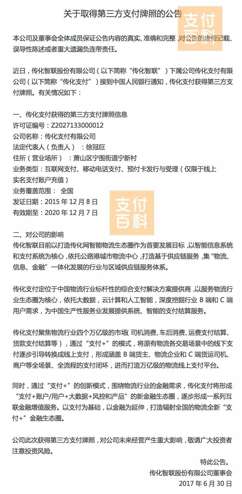 下图为传化支付方面下发的关于获牌的公告: