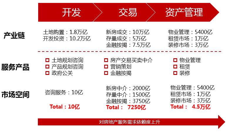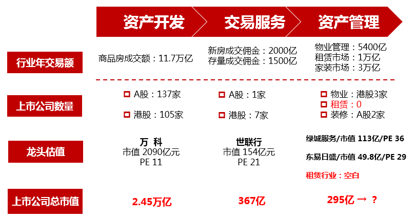 传统的房地产业务阶段上大致可以分为开发、交易、资产管理三个环节。按目前的市场空间估算,整个房地产服务市场空间在5.3万亿左右,市场中目前为止仍未成长出一个千亿市值的公司,A股市场中唯一的地产服务类公司世联行市值只有160亿左右,可见行业投资价值仍未得到充分挖掘。