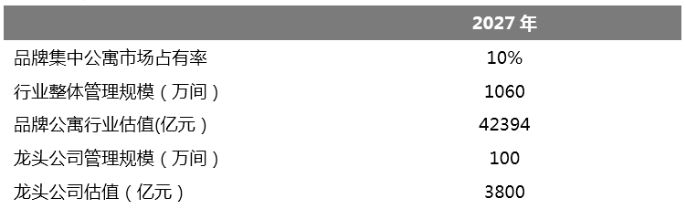 预测到2027年,品牌公寓占整个租赁市场的比重达到10%,行业整体管理规模预计为1060万间附近,品牌公寓行业的整体估值有望达到约为4.2万亿;龙头公司管理规模约为100万间,与之对应的估值3800亿。